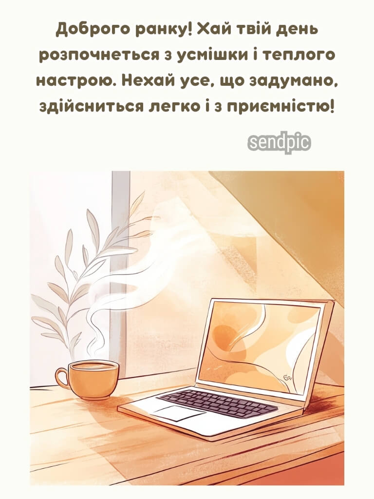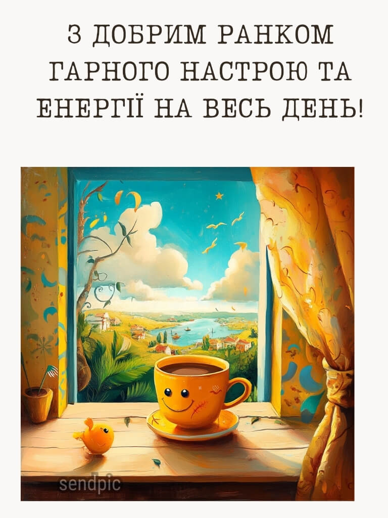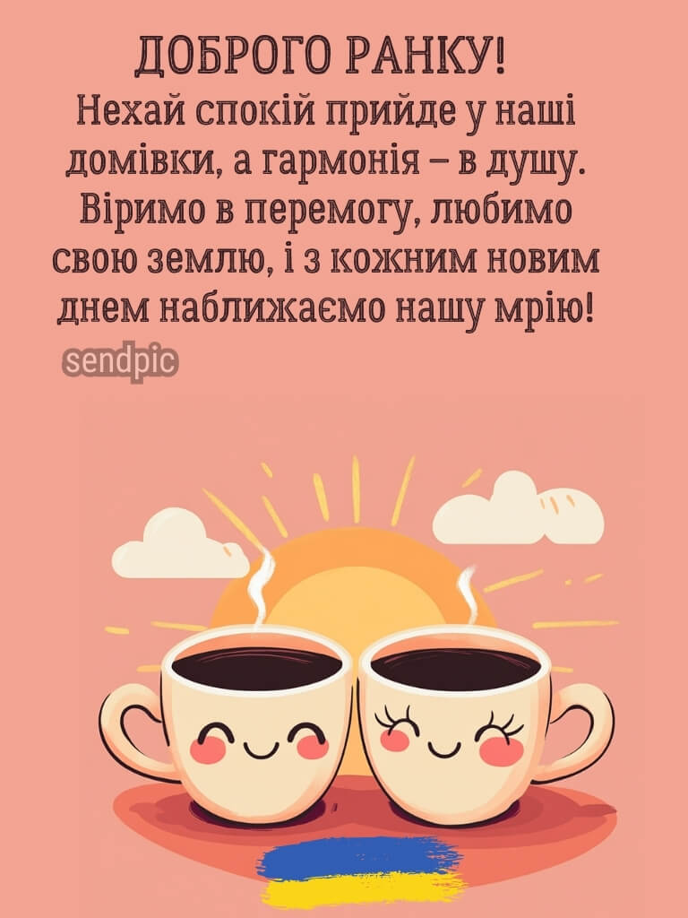 Мирного неба та щасливого ранку! Нехай цей день буде сповнений доброти, тепла та віри в перемогу, яка об’єднає нас у мирі та злагоді.